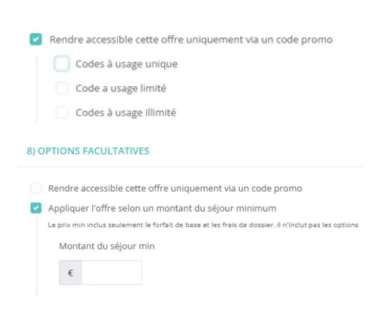 - Indiquer un montant minimum de séjour pour activer la promotion (ex. : 10 € offerts pour tout séjour de 200 €) Le montant minimum d’achat correspond au forfait de base + frais de dossier (hors options, même si elles sont obligatoires).