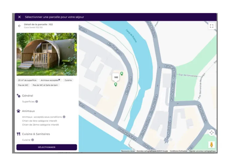 - Visualiser et choisir son emplacement ou hébergement, selon sa localisation dans le camping