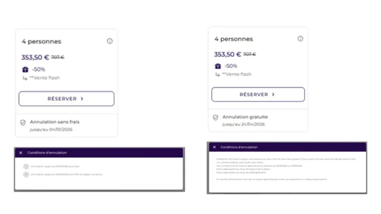 Les conditions d’annulation sont désormais affichées dès les résultats de recherche, en fonction du tarif sélectionné. Ces informations s’appuient sur vos paramétrages existants :
